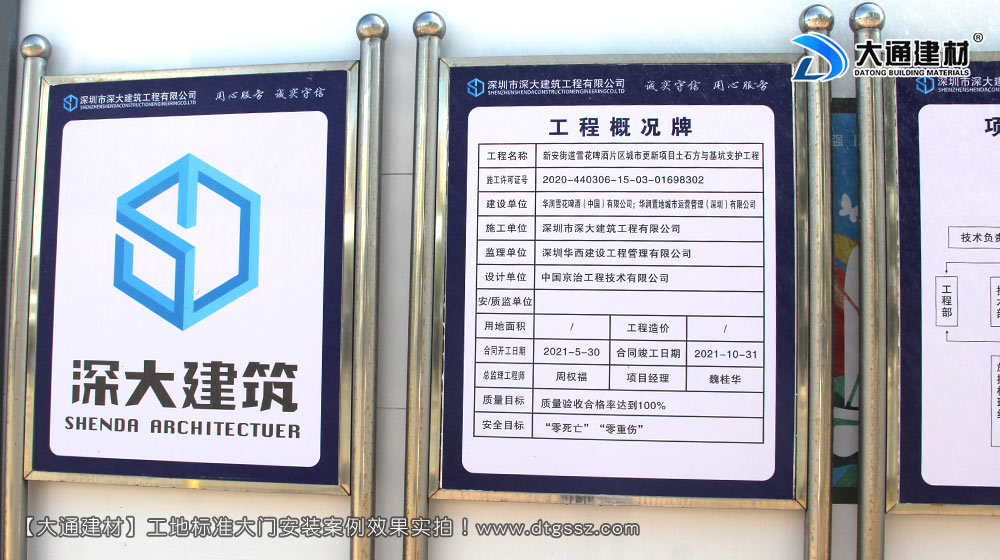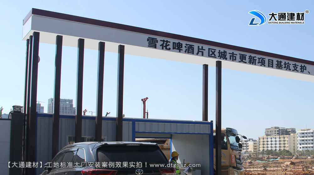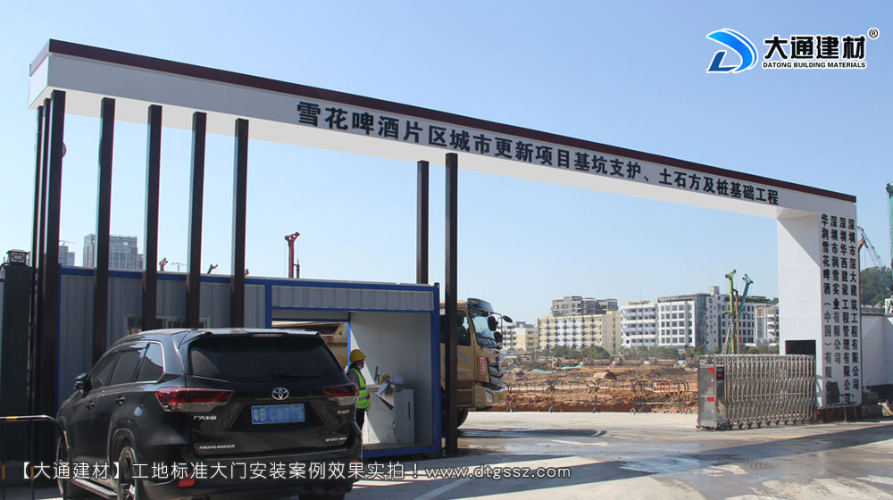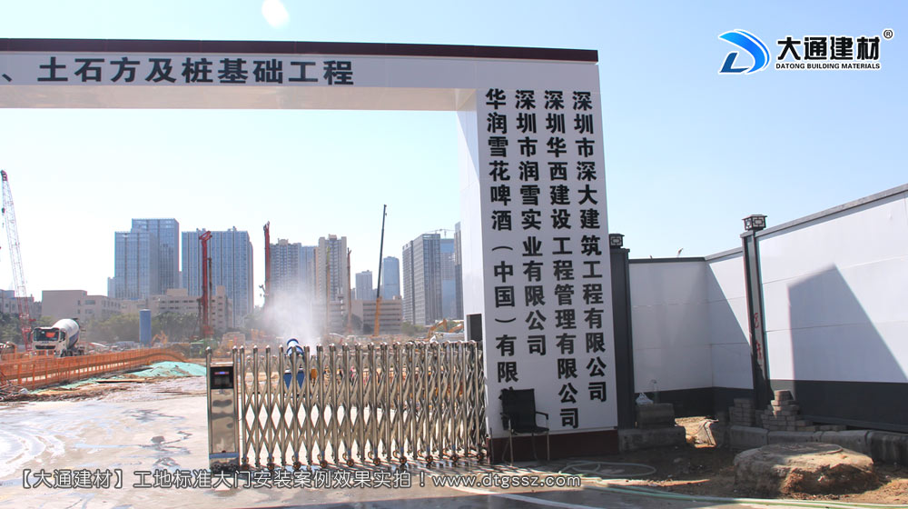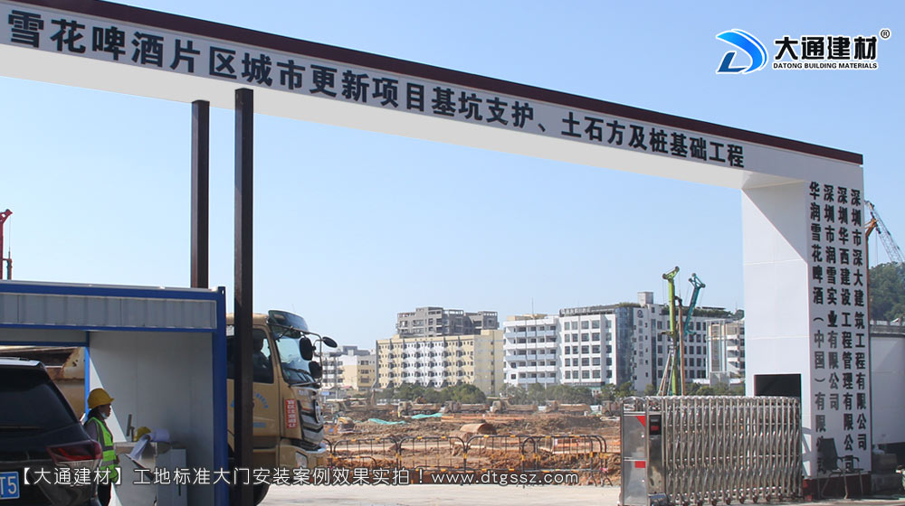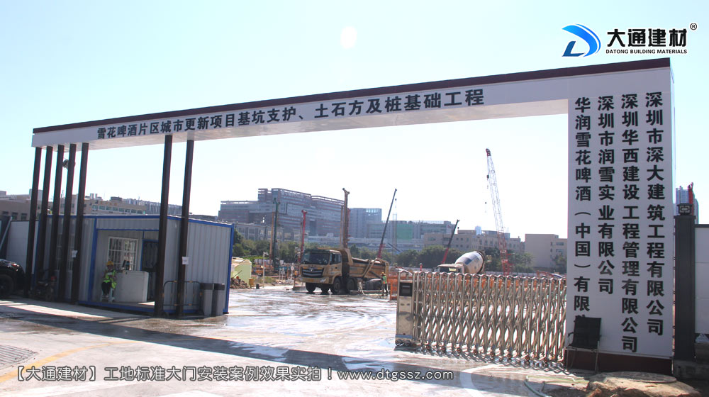 雪花啤酒(中國)有限公司,深圳雪花啤酒廠片區(qū)基坑支護(hù)、土石方與樁基工程施工大門定制安裝, 位于廣東省深圳市寶安區(qū)新安街道留仙三路,由深圳市深大建筑工程有限公司施工,工地大門選擇深圳市大通建材有限公司定制的鋼結(jié)構(gòu)工地施工大門,工地大門已經(jīng)安裝完成,現(xiàn)場實(shí)拍照片展示;