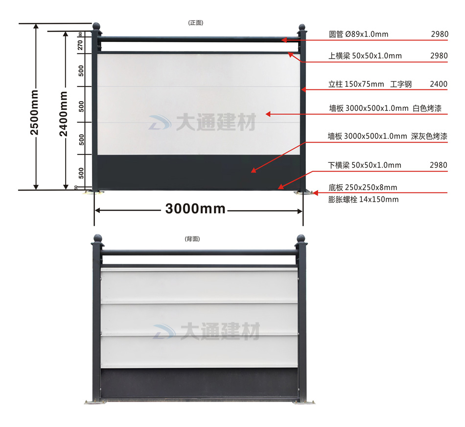 C類裝配式鋼結構圍擋(白色+深灰色墻板)烤漆款 規格參數如下圖展示